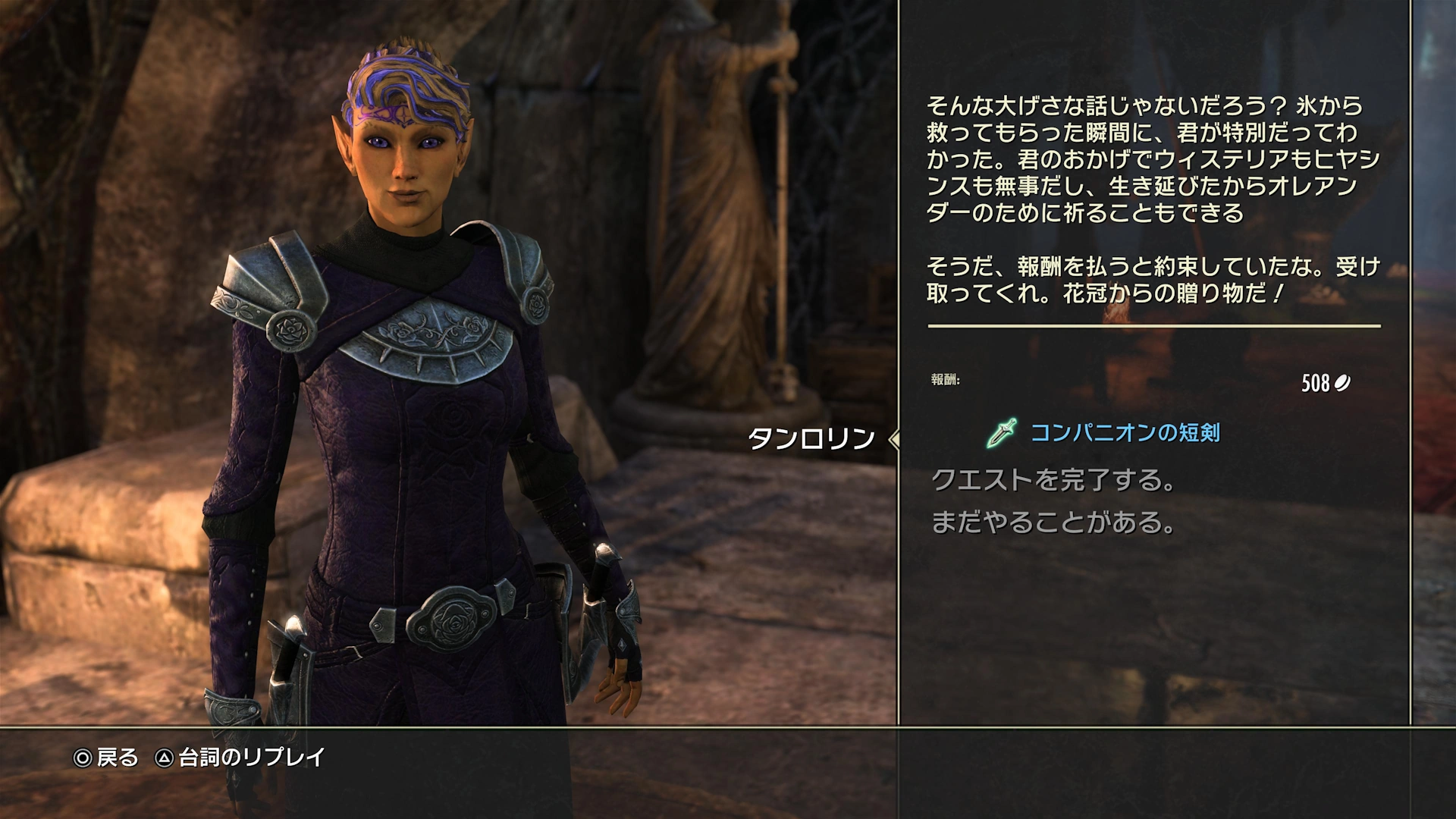 タンロリンを手助けして目的を達成するとコンパニオンとして加入してくれます。なお、クエストではパブリックダンジョンに潜る必要があるのでクエストの難易度は少しだけ高いです。