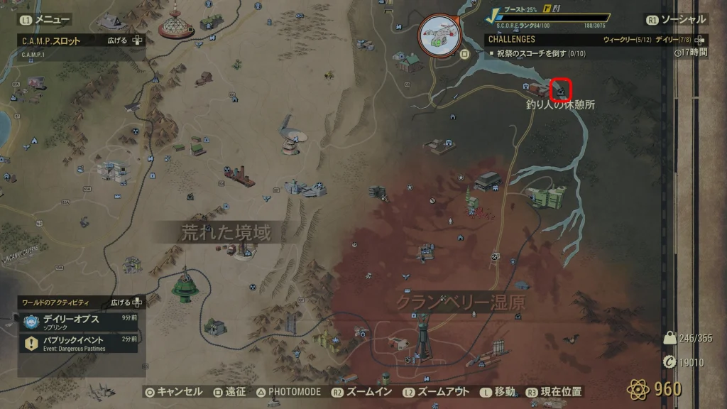 まぁ「釣り人の休憩所」自体でも釣りは実行できるのですが天候が操作できません。また釣り人の休憩所付近にもCAMPは建てられますが、実装されたばかりの新コンテンツなので、釣り人の休憩所付近にCAMPを建てるプレイヤーが多くCAMP被りが多発したため、筆者は今回紹介した場所にCAMPを建てました。