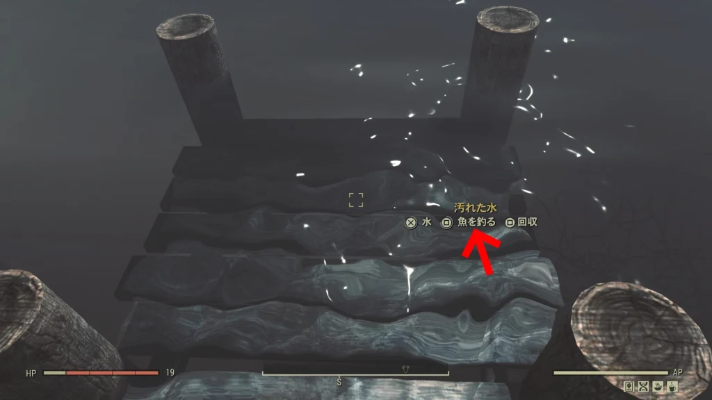 1つ目の場所は「ブラクソンの良質な医療用品」の北。ここの湖で釣りが実行できます。ファストトラベル地点からは少し距離がありますが、敵が出現しませんので安全に釣りをすることができます。またCAMPも設置可能なので、CAMPを設置したあとに天候装置を使えば天候に応じた魚を狙うことも可能です。