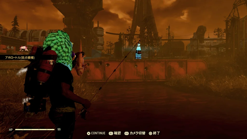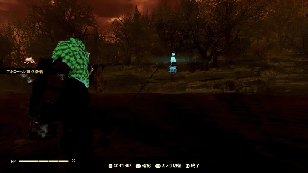 ここのCAMPに天候装置を設置し天候を「核」に変更した上で、いい釣り餌を使用することでアホロートル(斑点模様)を釣ることができました。