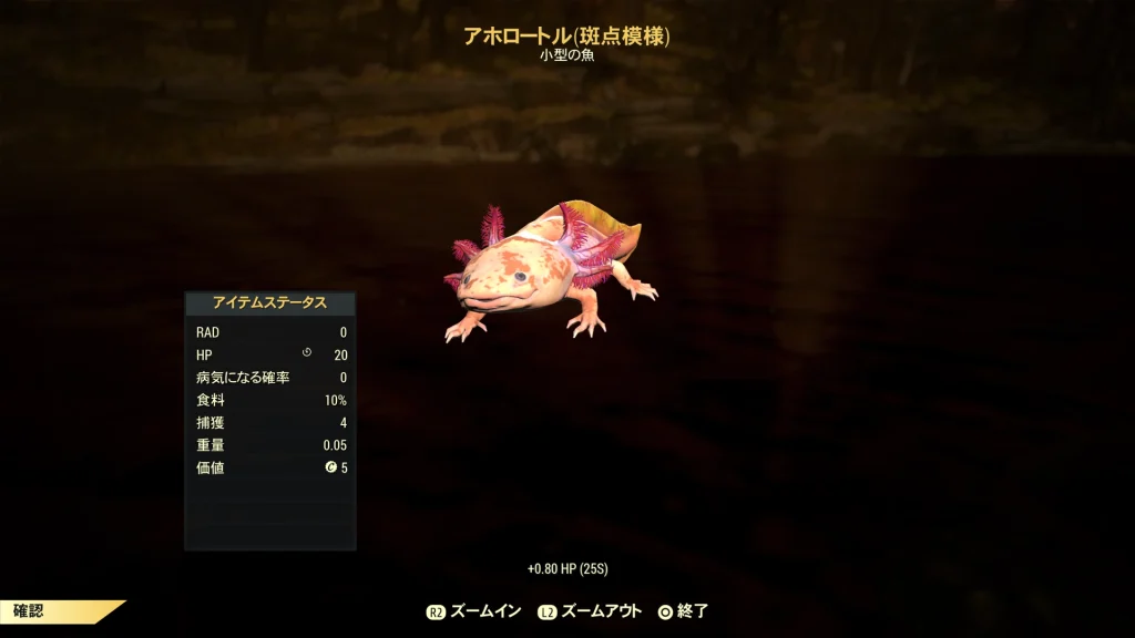 フォールアウト76でアホロートル11月分(斑点模様)が釣れる場所を紹介します。筆者自身がこの場所でアホロートル(斑点模様)を釣れることを確認しています。