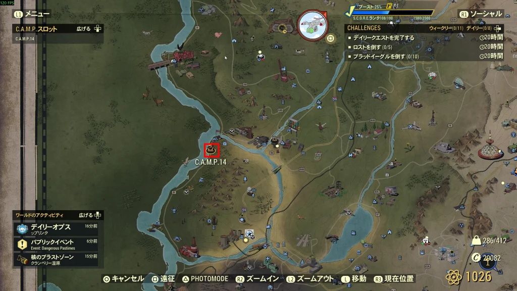 場所は森林地帯の「ヒルフォーク・ホットドッグ」近くの川沿いです。この川沿いは釣りできるスポットはたくさんあるので川沿いであれば正直場所はどこでもいいのですが、ジャンク鉱床がある人気の場所は他プレイヤーとCAMPが被る可能性があるので、そういった場所は避けるとよいでしょう。筆者は画像赤枠の付近にCAMPを建てました。