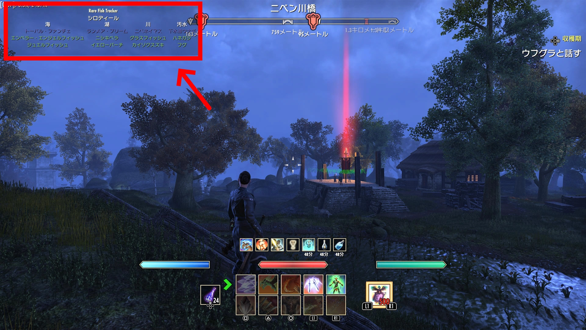画面上に現在居るマップ上で釣れるレアな魚を表示してくれるアドオンです。釣ったことがある魚は表示が変わるので、対象のマップで釣ったことがある魚と釣ったことがない魚の情報も得ることができ、釣りの実績を取る時に重宝します。