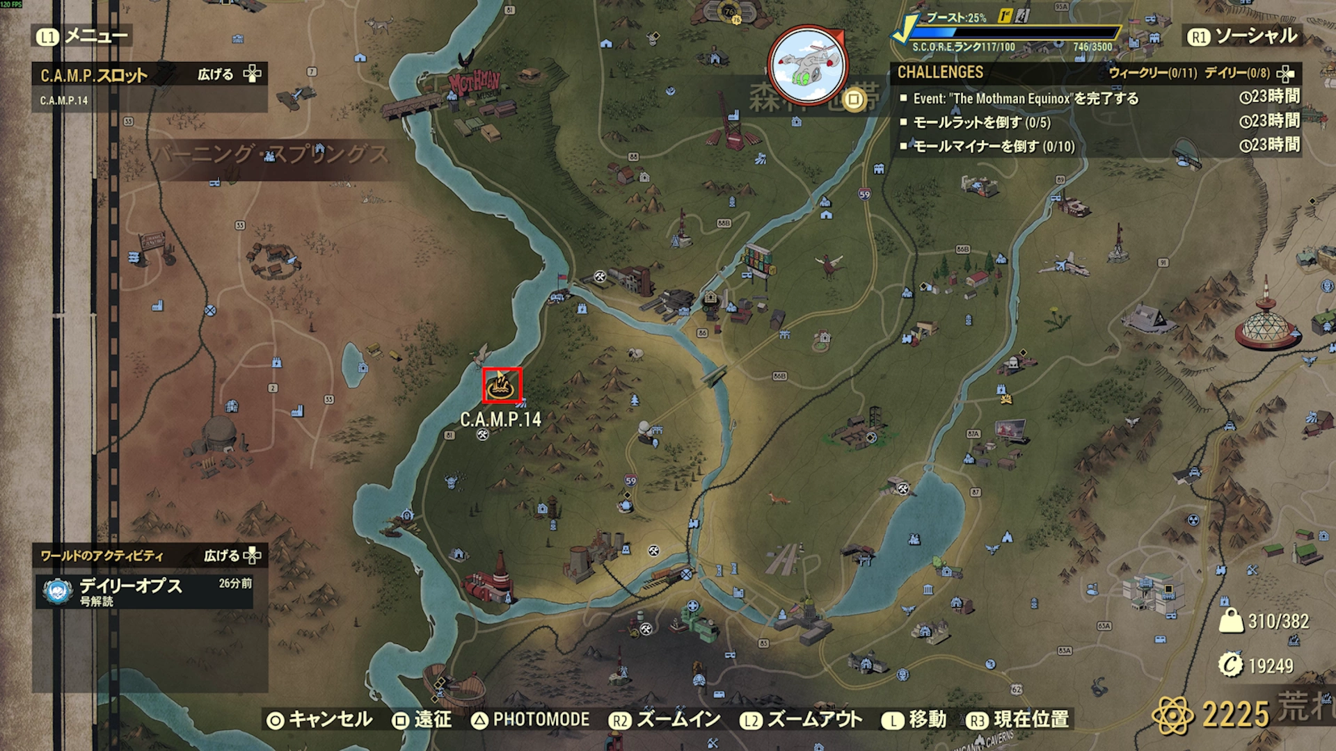 筆者はこの川沿い(画像赤枠あたり)にCAMPを設置して天候管理装置で天候を「核」に変更しました。